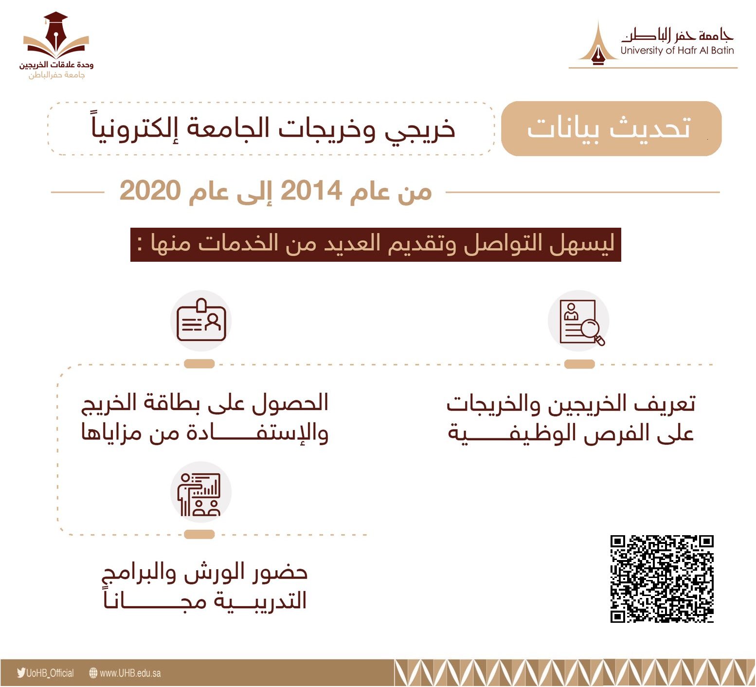 جامعة حفر الباطن On Twitter تدعــو وحــدة علاقــات الخريجيــن بـ جامعة حفر الباطن الخـريجيـن والخريجـات لتحـديـث بيـانـاتهـم إلكتـرونـي ا لتعـزيـز التواصـل والاستفــادة مـن الخدمــات التــي تقدمهــا الوحــدة Uhb Alumni لتحـديـث البـيانـات
